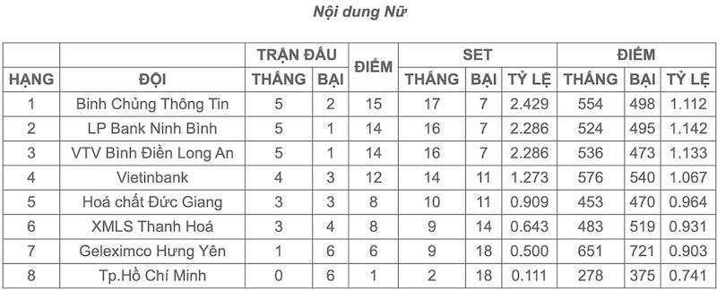 4 đội có vé vào bán kết gồm: Binh chủng thông tin (15 điểm), LPBank Ninh Bình (14 điểm), VTV Bình Điền Long An (14 điểm) và Vietinbank (12 điểm).