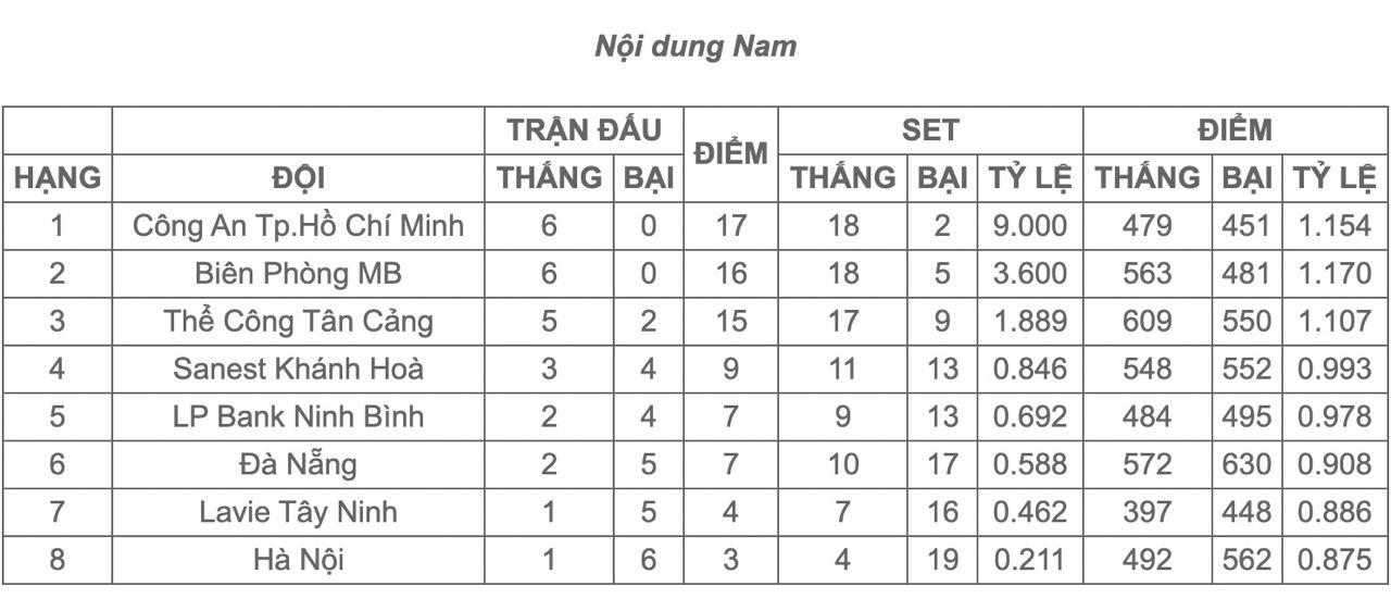 Bảng xếp hạng giải bóng chuyền vô địch quốc gia 2025 nội dung nam, nữ mới nhất: