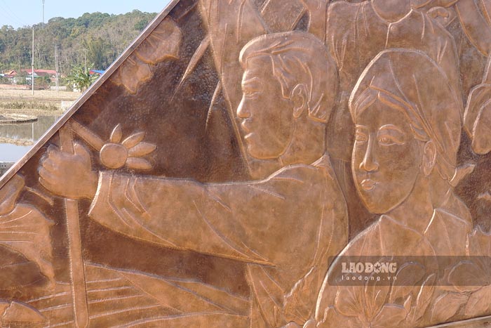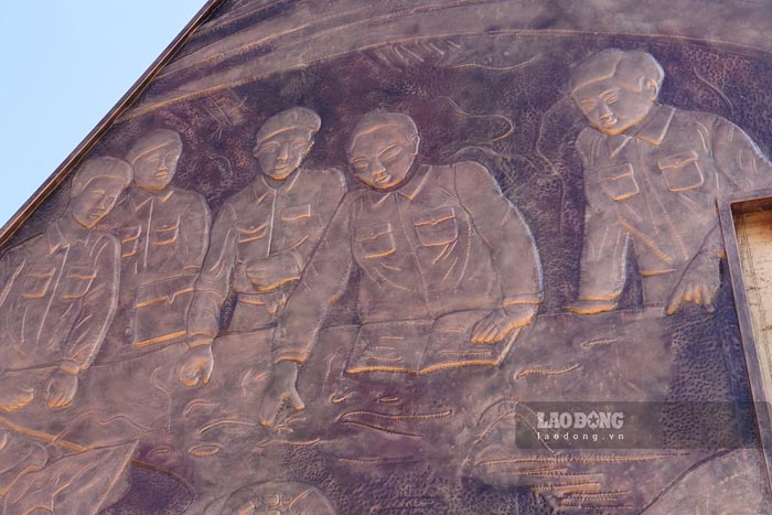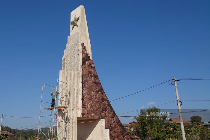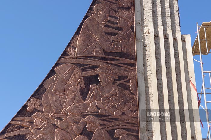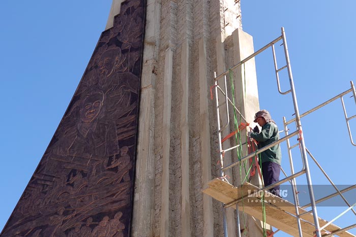 Các công nhân đang tiến hành hoàn thiện phần mỹ thuật. Hai mặt bên trụ cổng đã được ốp bức tranh phù điêu bằng đồng; mặt trước các chi tiết kiến trúc đang được ốp đá granit.