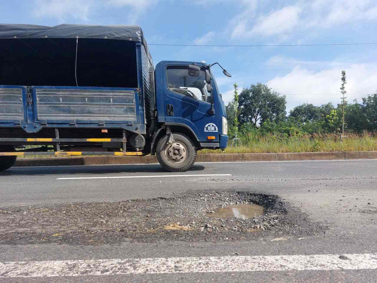 Trong khi đó, đoạn khu vực gần cầu Sông Bé tại Km12 + 484,73, nhiều ổ gà xuất hiện trên mặt đường. Rải rác trên dọc tuyến đường này cũng có các ổ gà, đá sỏi bị bong tróc tạo thành các hố sâu trên mặt đường