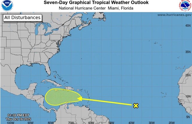 Tin bão, áp thấp mới nhất ngày 17.10 cho hay, Trung tâm Bão Quốc gia Mỹ đang theo dõi một áp thấp hình thành ngoài khơi bờ biển phía tây châu Phi và hiện ở giữa Đại Tây Dương. Áp thấp này đang di chuyển nhanh về phía vùng Caribe, với 20% khả năng mạnh lên trong 7 ngày tới.