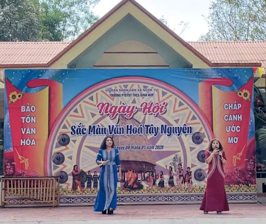 Bên cạnh đó, học sinh Trường PTDTBT THCS Đinh Núp tự tin trình diễn các tiết mục múa xoang, văn nghệ dân gian được chuẩn bị công phu, thể hiện niềm tự hào và ý thức gìn giữ bản sắc dân tộc.