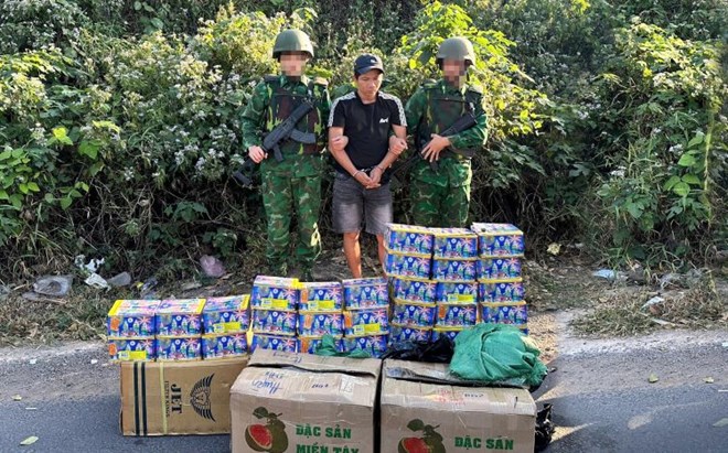 Quảng Trị - Đồn Biên phòng cửa khẩu quốc tế Lao Bảo phối hợp các lực lượng bắt giữ một đối tượng vận chuyển trái phép 30 hộp pháo hoa nổ từ Lào vào Việt Nam.