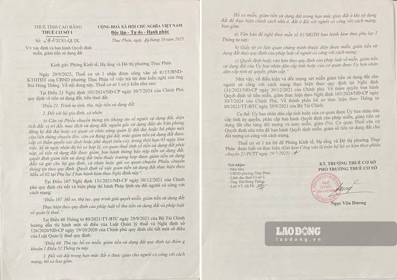 Trước đó, vào tháng 7/2025, gia đình ông Bùi Hùng Thắng nộp hồ sơ xin chuyển 125m² đất sang đất ở đô thị và đề nghị được hưởng chính sách giảm tiền sử dụng đất. UBND Phường Thục Phán đã ban hành quyết định cho phép chuyển mục đích sử dụng đất nhưng cho rằng, nội dung miễn, giảm không thuộc thẩm quyền nên chuyển hồ sơ sang Thuế cơ sở 1 (Thuế tỉnh Cao Bằng). Tại cơ quan thuế, hồ sơ của gia đình anh Nam liên tục bị yêu cầu bổ sung rồi trả lại. Gần nhất, ngày 14.10.2025, Thuế cơ sở 1 yêu cầu phải có “Quyết định cho phép miễn, giảm” của UBND tỉnh hoặc cơ quan được UBND tỉnh ủy quyền thì mới có căn cứ xem xét. Không còn cách nào khác, gia đình anh Nam gửi đơn tới UBND tỉnh Cao Bằng. Tuy nhiên, Ban Tiếp công dân tỉnh sau đó lại chuyển đơn về UBND phường Thục Phán đề nghị địa phương giải quyết.