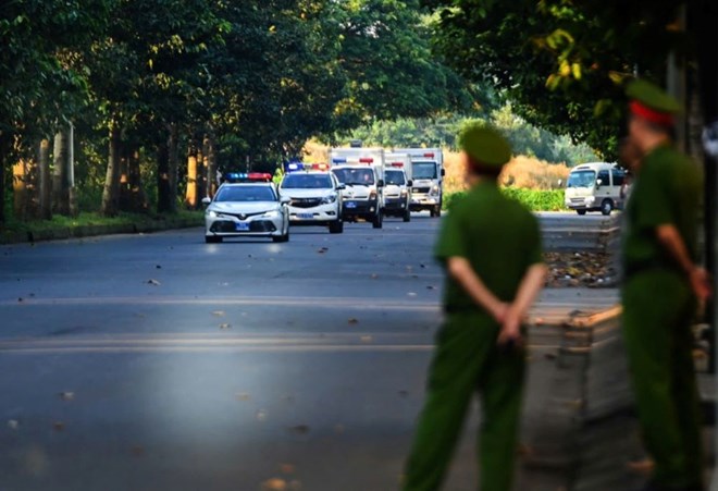 Khoảng hơn 8h ngày 25.3, xe chở bị cáo Trương Mỹ Lan cùng 27 bị cáo khác đến TAND Cấp cao TPHCM. Trước cổng tòa, lực lượng công an đã có mặt để giữ an ninh trật tự. Ảnh: Anh Tú