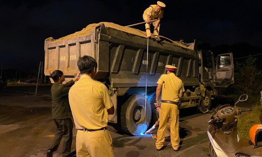 Lực lượng CSGT Lâm Đồng kiểm tra phương tiện có dấu hiệu chở hàng quá khổ, quá tải. |