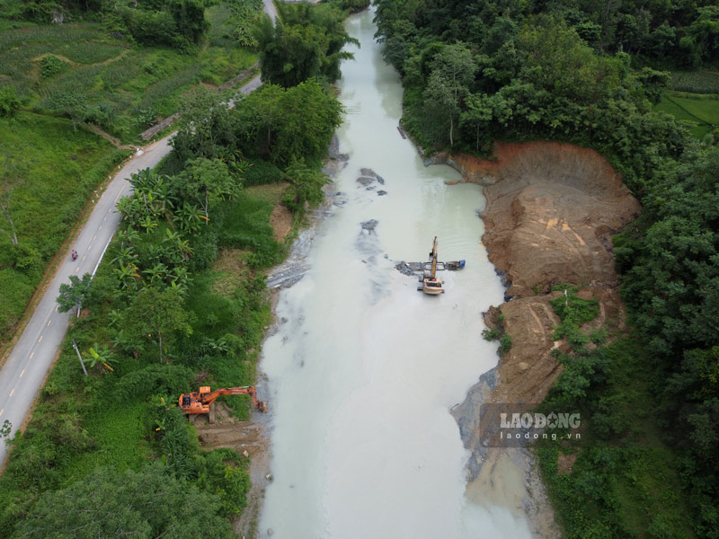 Hai máy xúc và một thuyền nhỏ liên tục đào bới lòng sông Bằng, khiến dòng nước chuyển màu trắng đục, dòng chảy bị ảnh hưởng do các bờ tạm được đắp lên.