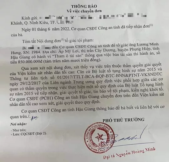 Sáng 13/6, theo nguồn tin của Báo Người Lao Động, đại tá Nguyễn Hoàng Minh, Phó thủ trưởng Cơ quan Cảnh sát điều tra Công an tỉnh Hậu Giang đã ký thông báo chuyển đơn lên VKSND Tối cao vụ một cán bộ ở Chi cục Thi hành án Dân sự huyện Phụng Hiệp bị tố tham ô tài sản 850 triệu đồng thông qua việc bán tài sản thi hành án.