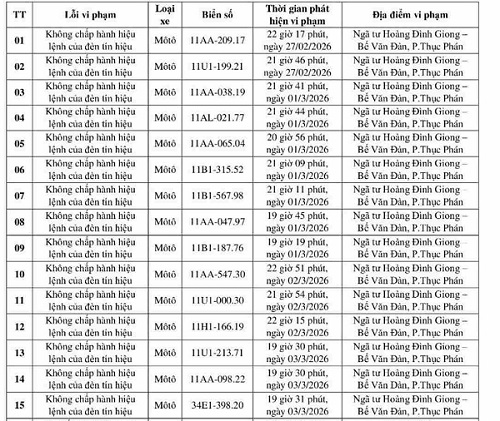 Cảnh sát giao thông Cao Bằng cho biết, thời gian từ ngày 26.2 đến ngày 4.3, thông qua hệ thống camera, lực lượng chức năng phát hiện nhiều trường hợp vi phạm giao thông, bị phạt nguội. Trong số này có các chủ xe vi phạm lỗi vượt đèn đỏ tiêu biểu như sau: