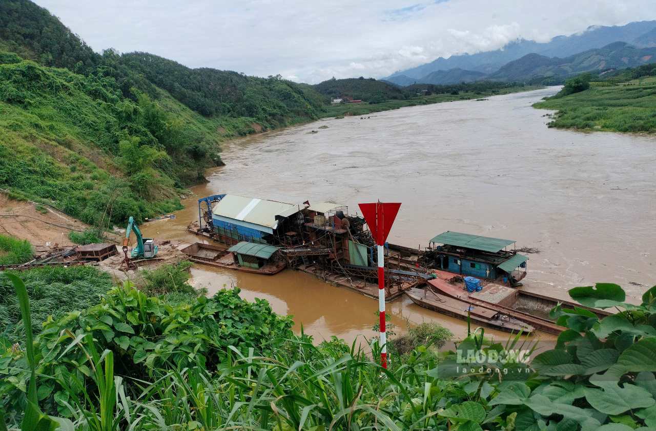 Thời điểm phóng viên ghi nhận ngày 8.5, tại khu vực bãi tập kết cát này xuất hiện 3 máy xúc cỡ lớn đang hoạt động, cùng nhiều phương tiện vận tải chờ sẵn để lấy cát. Dưới dòng sông, 5 tàu cát, 1 tàu cuốc đang trực chờ sẵn bơm cát lên bãi.