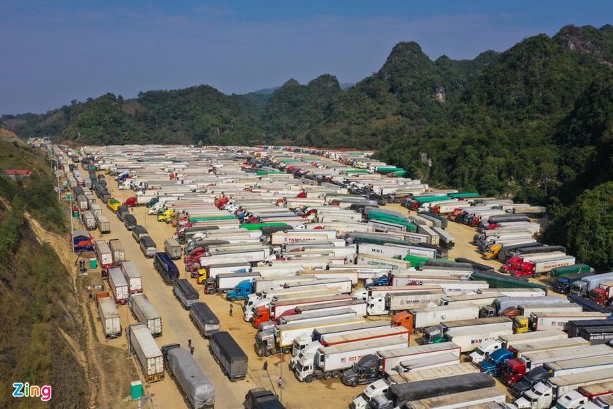 Tình trạng ùn tắc nông sản tại cửa khẩu ở Lạng Sơn kéo dài trong nhiều ngày khiến các xe container phải "nằm im" chờ thông quan. Ảnh: Thạch Thảo.
