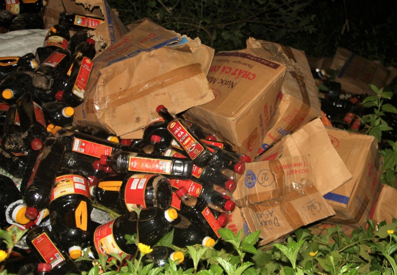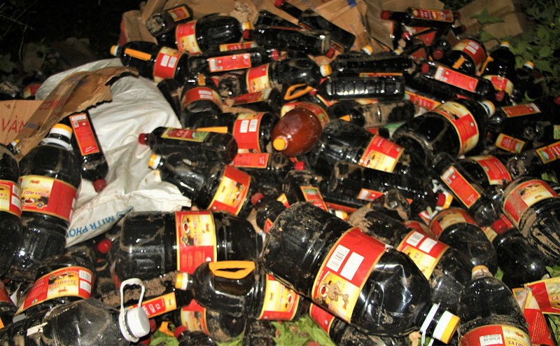 Cơ quan chức năng thu gom, kiểm đếm cả nghìn chai nước mắm bị vứt bỏ, không loại trừ khả năng đây là hàng giả mạo thương hiệu. Ảnh: Trường An