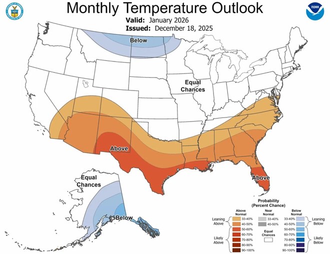 NOAA dự báo chỉ một dải hẹp ở cực bắc nước Mỹ có khả năng lạnh hơn mức trung bình trong tháng 1, tập trung tại phía tây bang Minnesota, phần lớn Bắc Dakota và khu vực đông bắc Montana. Đông nam Alaska cũng được dự báo có nhiệt độ thấp hơn đôi chút so với trung bình nhiều năm.