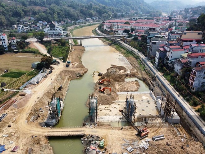 Cao Bằng - Các công nhân đang tất bật xây dựng trên công trình đập dâng nước giữa lòng thành phố.