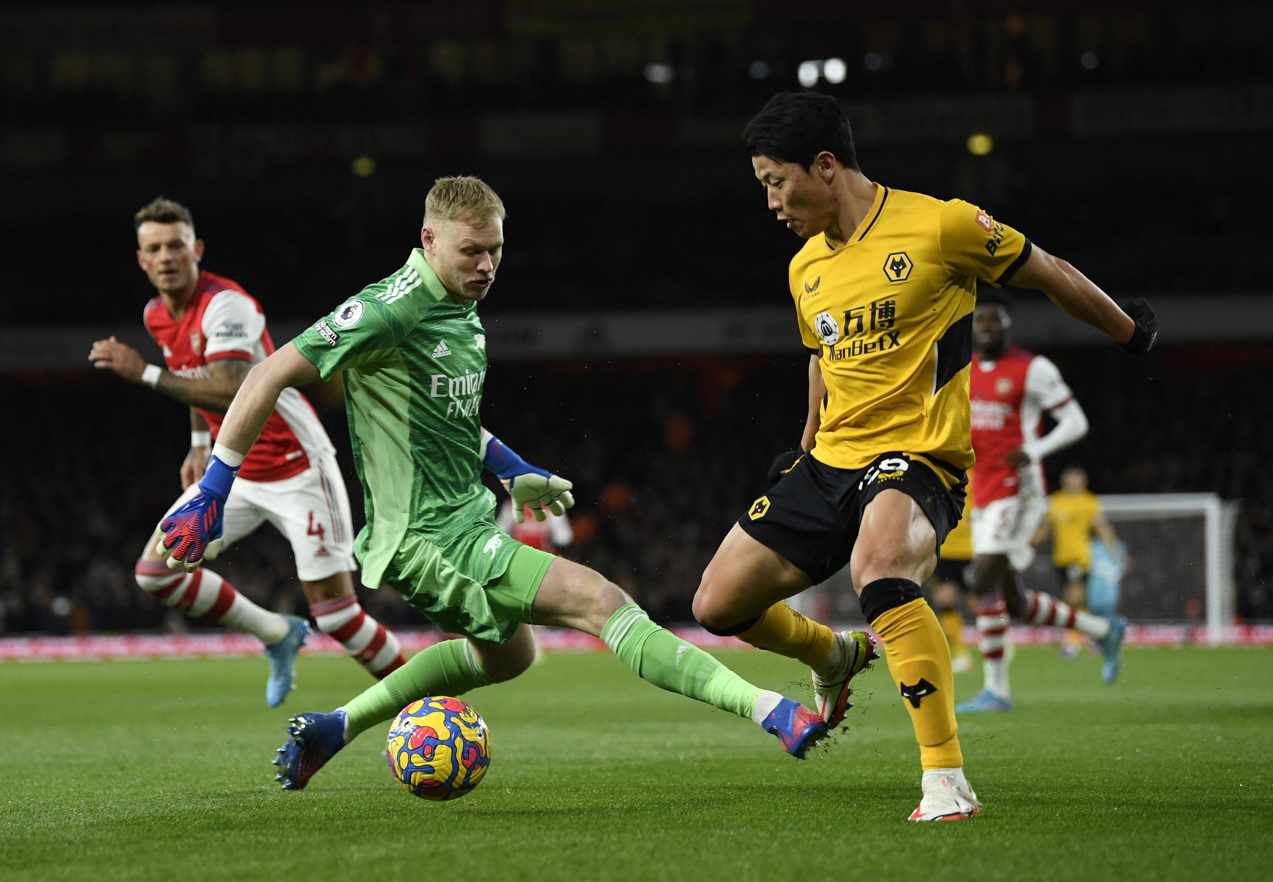 Hàng thủ Arsenal không thể bắt nhịp với trận đấu và mắc sai sót nghiêm trọng ở phút thứ 10. Đường chuyền về bất cẩn của Gabriel Magalhaes tạo điều kiện để Hwang Hee-chan băng xuống, rê qua thủ môn rồi dứt điểm tung lưới chủ nhà ở góc hẹp.