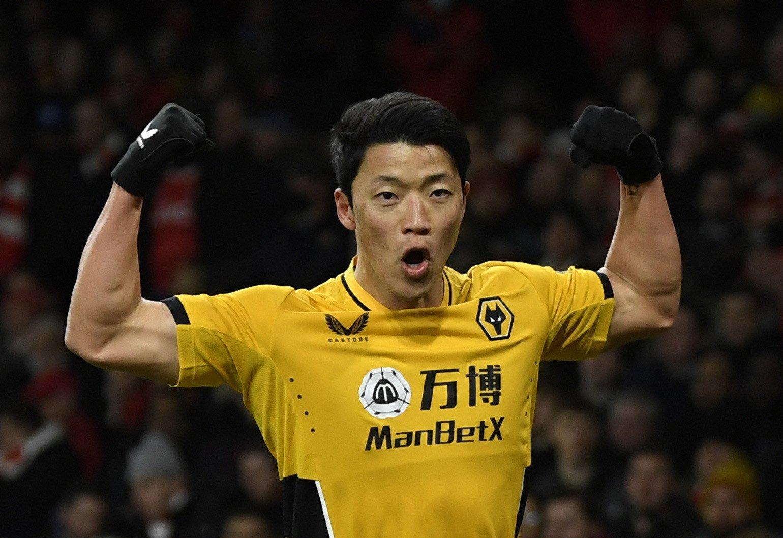 Chân sút người Hàn Quốc ăn mừng bàn thắng thứ 5 tại giải Ngoại hạng Anh mùa này. Đây cũng là pha lập công đầu tiên của Hwang cho Wolves sau 10 trận tịt ngòi.