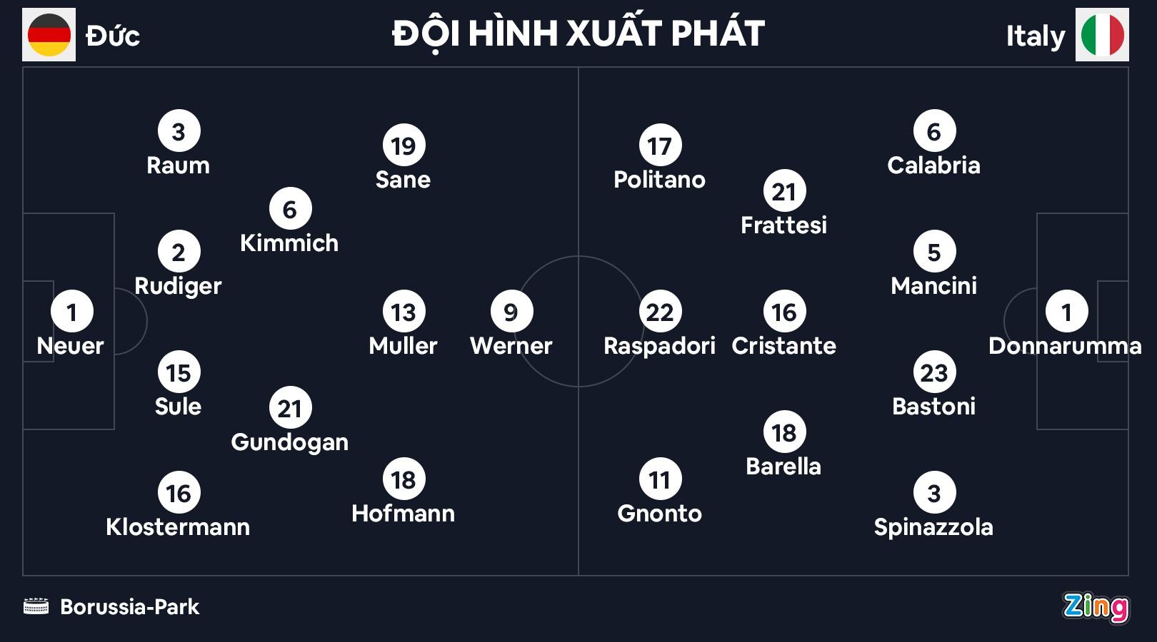 Italy cố tìm cách giảm nhịp độ trận đấu nhưng không thể. Phút bù giờ hiệp một, nhà ĐKVĐ EURO nhận bàn thua thứ hai sau tình huống phạm lỗi trong vùng cấm của Bastoni với Jonas Hofmann. Ilkay Gundogan dễ dàng đánh lừa Gianluigi Donnarumma để giúp Đức bước vào giờ nghỉ với lợi thế 2 bàn.