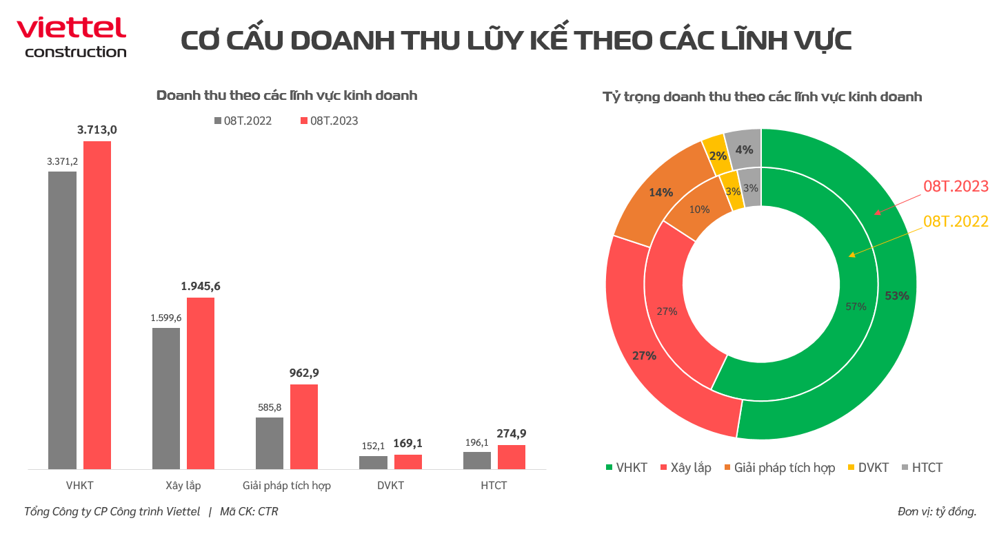 Theo Viettel Construction, trong 8 tháng đầu năm, vận hành khai thác là mảng đóng góp nhiều nhất vào doanh thu với 3.713 tỷ đồng, tăng 10% so với cùng kỳ, mảng xây lắp đóng góp 1.946 tỷ đồng doanh thu, chiếm 27%. Cũng trong 8 tháng đầu năm, công ty ký kết 1.200 tỷ đồng hợp đồng B2B và bàn giao dự án xây dựng dân dụng đầu tiên tại nước ngoài (Myanmar) trị giá 24 tỷ đồng. Bên cạnh đó, Viettel Construction đã ký kết 954 hợp đồng B2C, giá trị 686 tỷ đồng. Lũy kế tỷ lệ phủ công trình cho CTR thi công đạt 653/701 huyện (93,1%); 2.305/10.609 xã (21,7%).