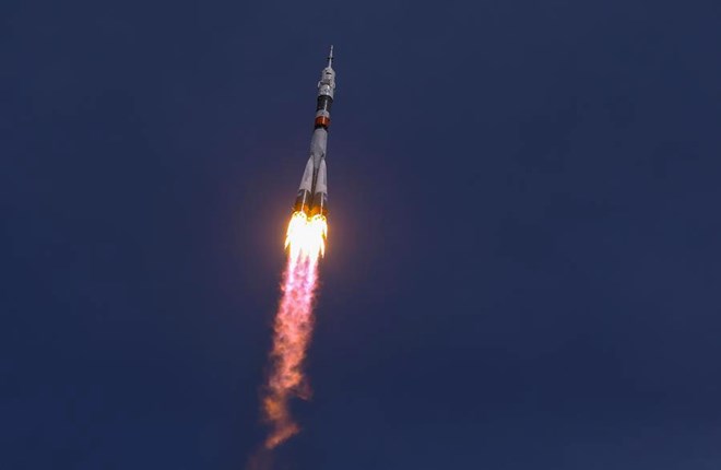 Tàu vũ trụ Soyuz MS-04 của Nga rời bệ phóng tại sân bay vũ trụ Baikonur ở Kazakhstan vào ngày 20.4.2017. Ảnh: Xinhua