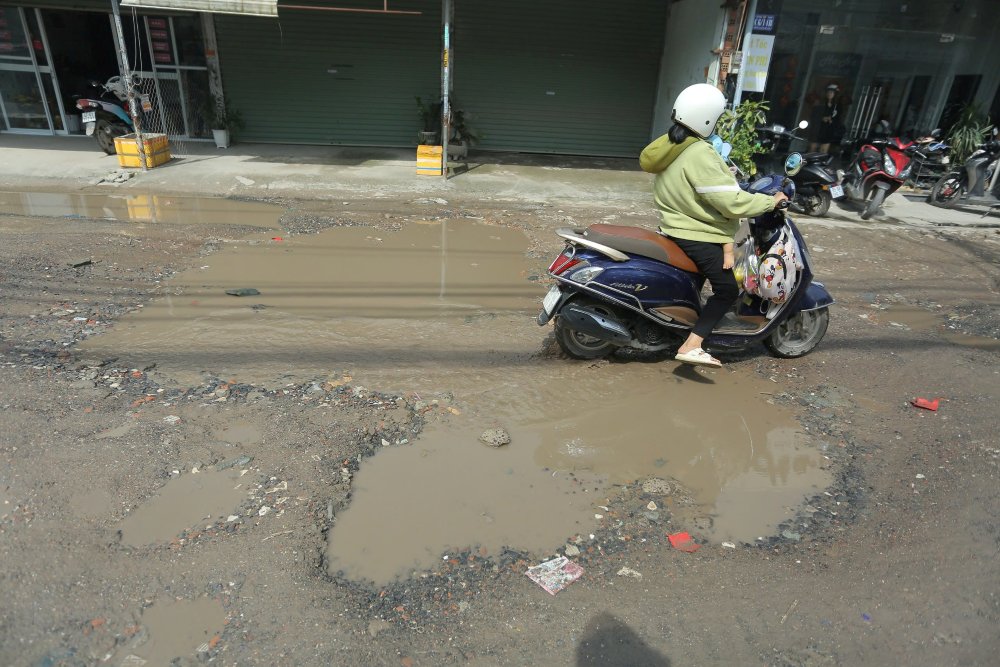 Mặt đường chi chít "ổ gà, ổ voi", ngập nước, gây khó khăn và nguy hiểm cho người tham gia giao thông. Tình trạng hư hỏng xuất hiện rải rác dọc tuyến, buộc người dân phải di chuyển chậm, né tránh để không bị trượt ngã. Đoạn hư hỏng nặng nhất nằm gần khu vực giáp đường Nữ Dân Công.