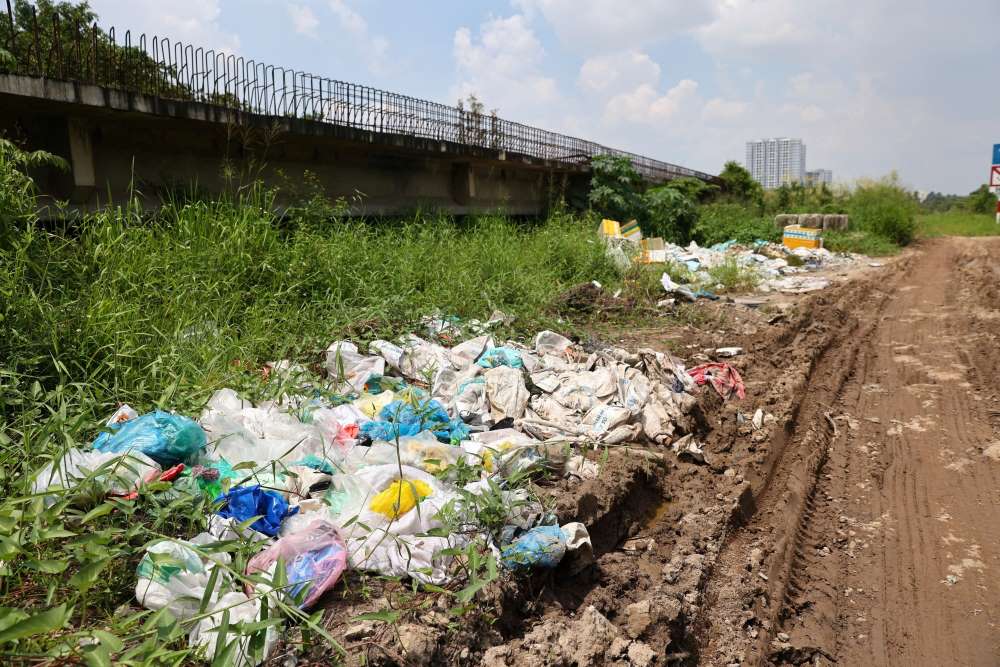 Đoạn 3 thuộc tuyến Vành đai 2 hiện đang bỏ hoang nhiều năm, rác thải và cỏ mọc um tùm. Ảnh: Anh Tú