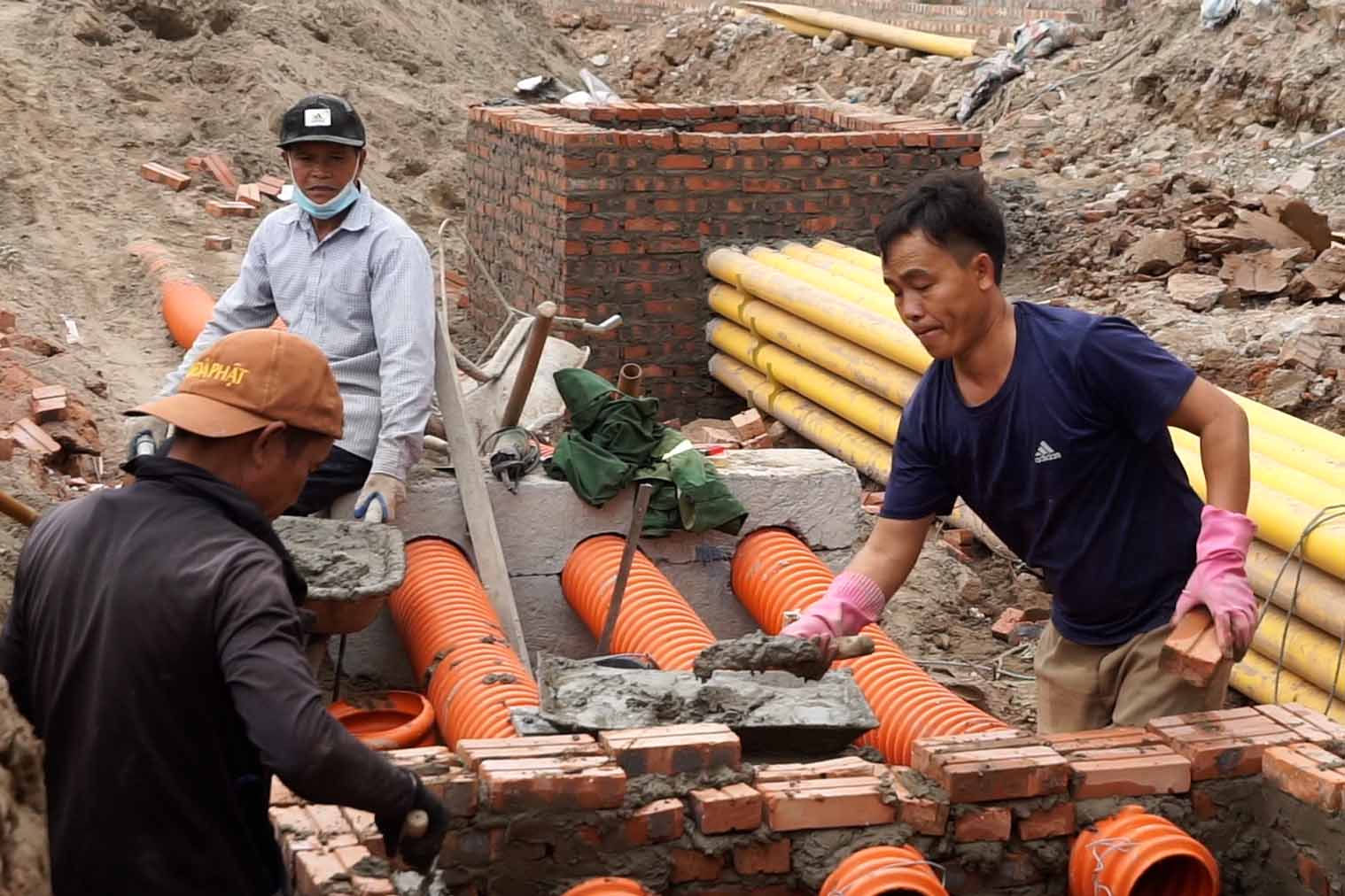 Trên công trường, các mũi thi công đang tiến hành đồng loạt các hạng mục kỹ thuật như đường thoát nước, đường điện, đường viễn thông.