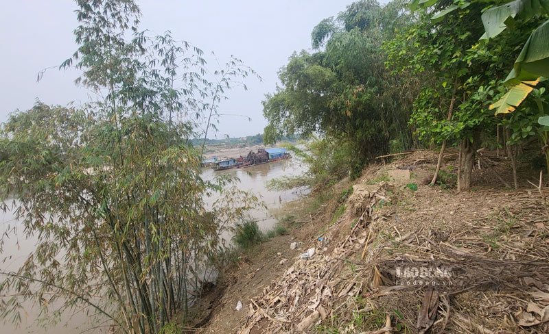 Dọc tuyến sông, nhiều điểm sạt lở hình thành, đất cát cứ trôi xuống sau mỗi nhịp sóng nước. Ngoài giữa sông nhiều tàu hút cát đang neo đậu.