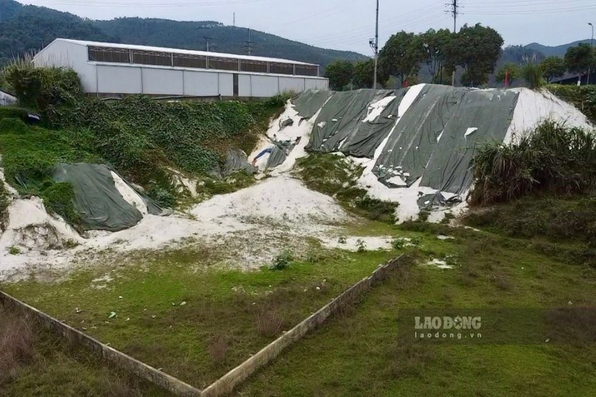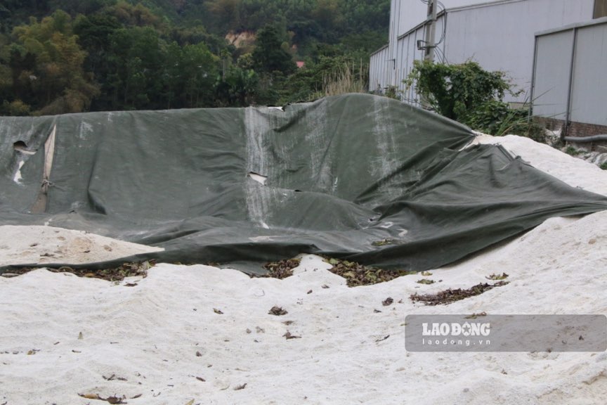 Bãi tập kết trên không có rào chắn bao quanh hay biện pháp bảo vệ môi trường mà được che đậy bằng những tấm bạt lớn. Nhiều tấm đã mục nát, rách tả tơi, để lộ bên dưới lớp khoáng sản lạ màu trắng.