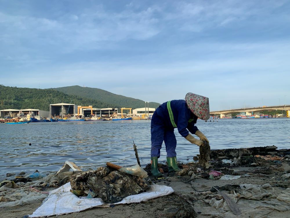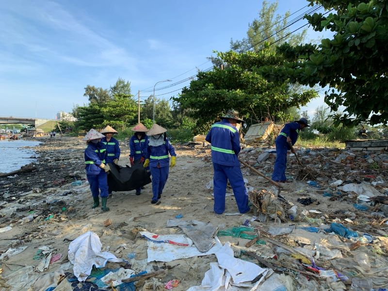 Trước thực trạng đó, chiều 5.8, lực lượng công nhân thuộc Công ty Môi trường đô thị Đà Nẵng đã có mặt tại vịnh Mân Quang để tiến hành thu gom lượng rác thải tồn đọng, phần nào trả lại sự sạch sẽ cho tuyến bờ vịnh.