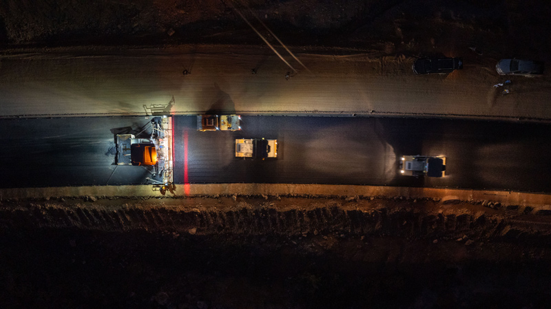 Ở Km58, xã Đông Khê, dây chuyền thảm nhựa được duy trì thi công liên tục ngày đêm, với sản lượng đạt khoảng 2.000 tấn mỗi ngày.