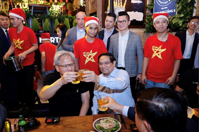 Theo Báo Chính Phủ, tối 5.12, Thủ tướng Chính phủ Phạm Minh Chính đã cùng nhà sáng lập, Chủ tịch Tập đoàn công nghệ NVIDIA Jensen Huang thăm đền Ngọc Sơn, dạo ngắm hồ Hoàn Kiếm, thăm khu phố cổ Hà Nội.