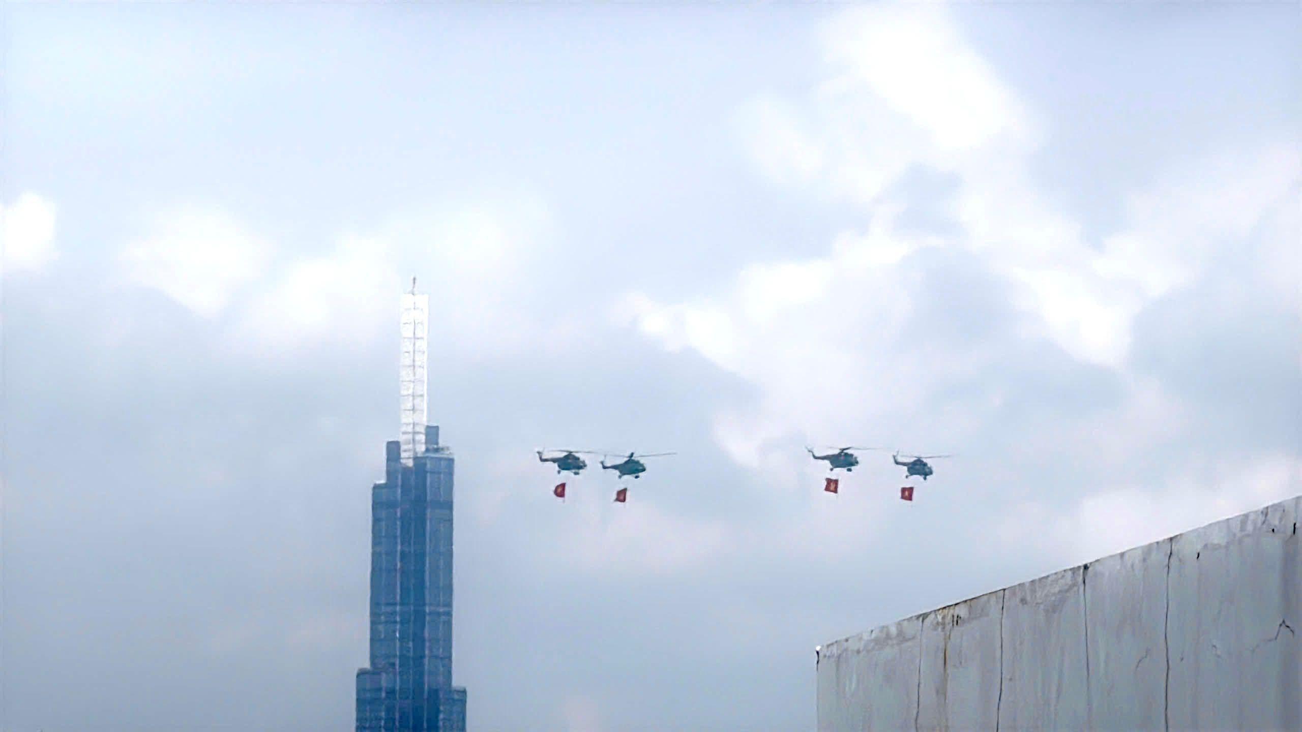 Phi đội trực thăng kéo cờ bay qua tòa nhà Landmark 81 (quận Bình Thạnh). Ảnh: Anh Tú