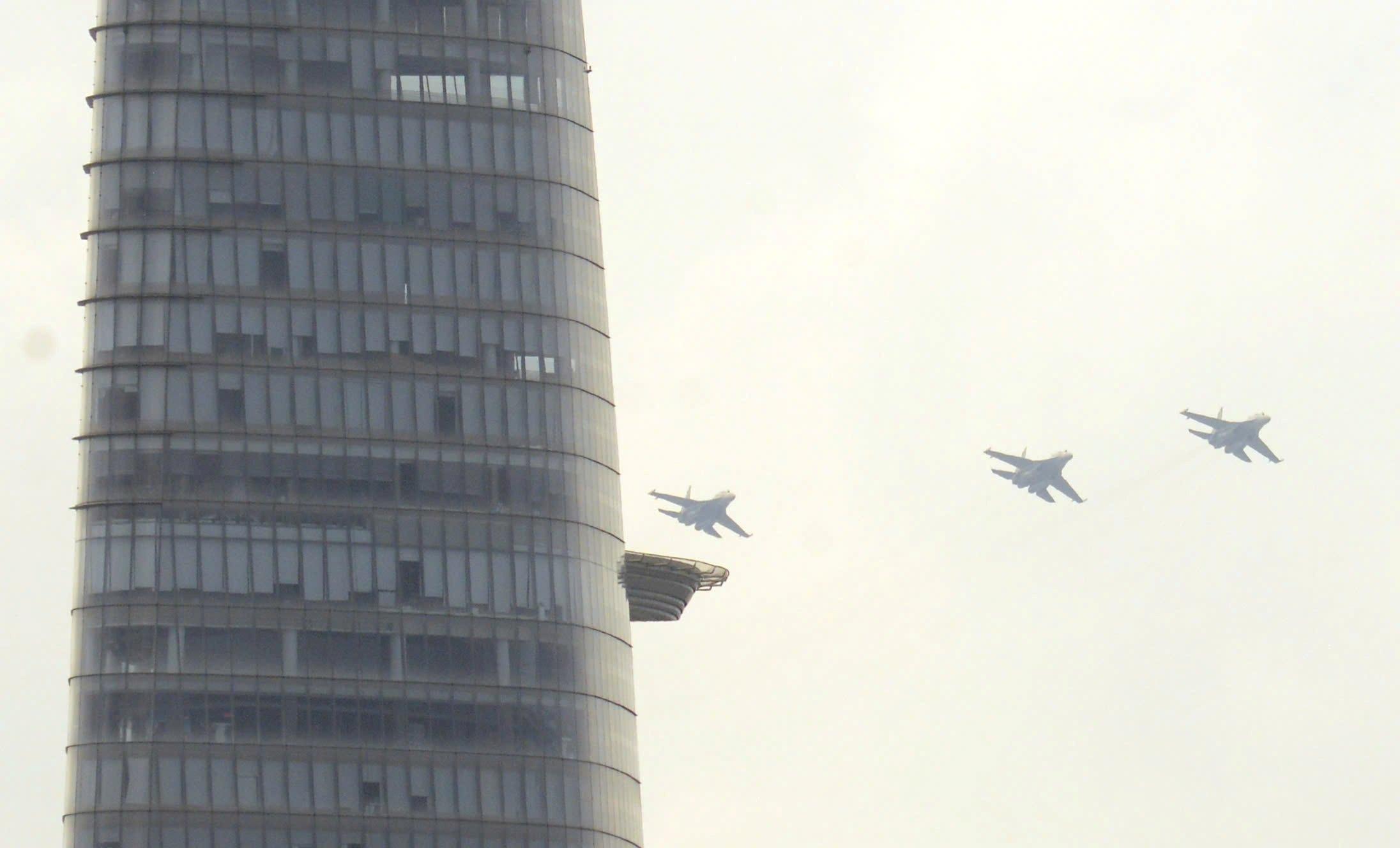 Trực thăng, tiêm kích bay ngang qua các tòa nhà ở Quận 1. Ảnh: Anh Tú