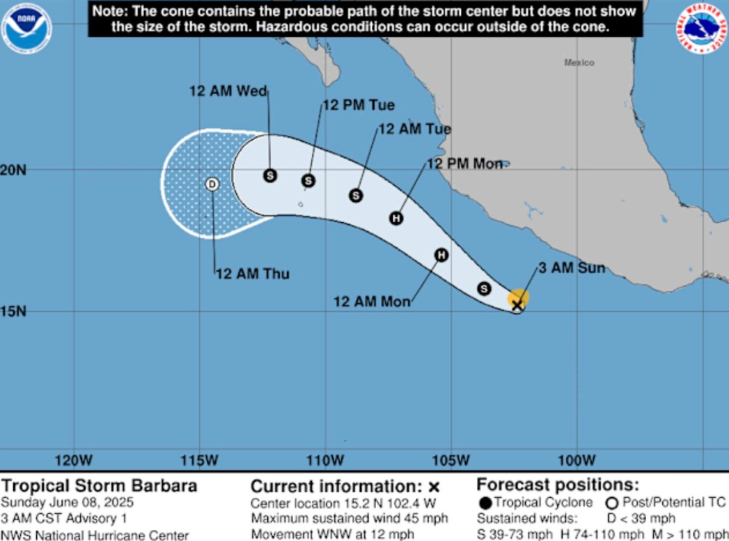Các nhà dự báo thời tiết của NHC nhận định, Barbara sẽ tiếp tục di chuyển về phía tây - tây bắc trong vài ngày tới trước khi chuyển hướng sang phía tây với tốc độ chậm hơn vào ngày 10.6.