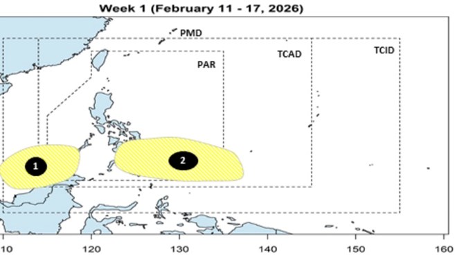 Tin bão, áp thấp mới nhất của Cơ quan Thiên văn, Địa Vật lý và Khí quyển Philippines (PAGASA) ngày 11.2 cho biết, 2 áp thấp có thể hình thành gần Philippines dịp Lễ Tình nhân (ngày 14.2).