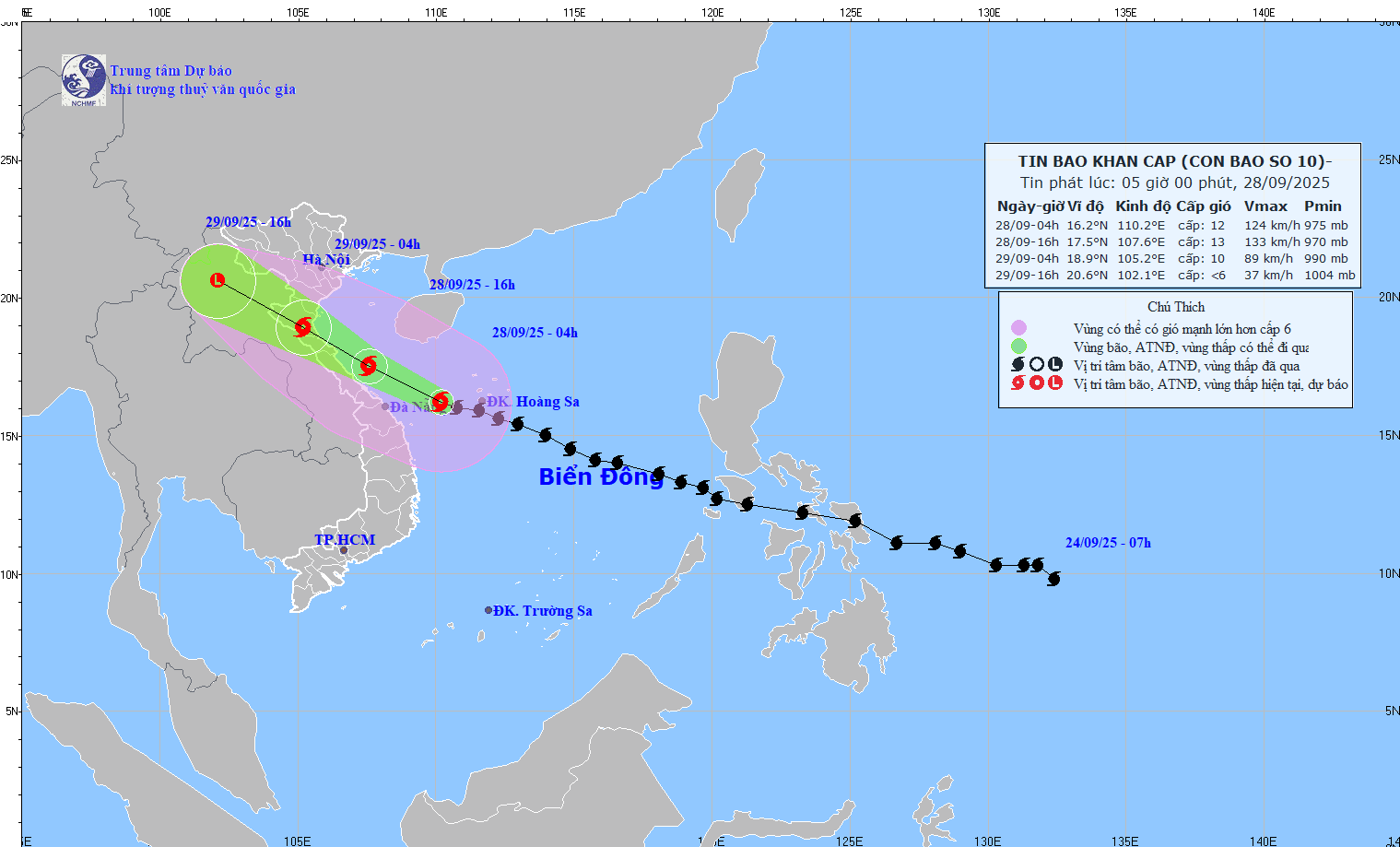 Trong khi đó, dự báo thời tiết về cơn bão số 10 trên Biển Đông, Trung tâm Dự báo Khí tượng Thủy văn Quốc gia Việt Nam (NCHMF) cho hay, vào hồi 6h ngày 28.9, vị trí tâm bão ở khoảng 16,2 độ Vĩ Bắc; 109,7 độ Kinh Đông, cách Bắc Quảng Trị khoảng 360km về phía Đông Đông Nam, cách Thành phố Đà Nẵng khoảng 150km về phía Đông.