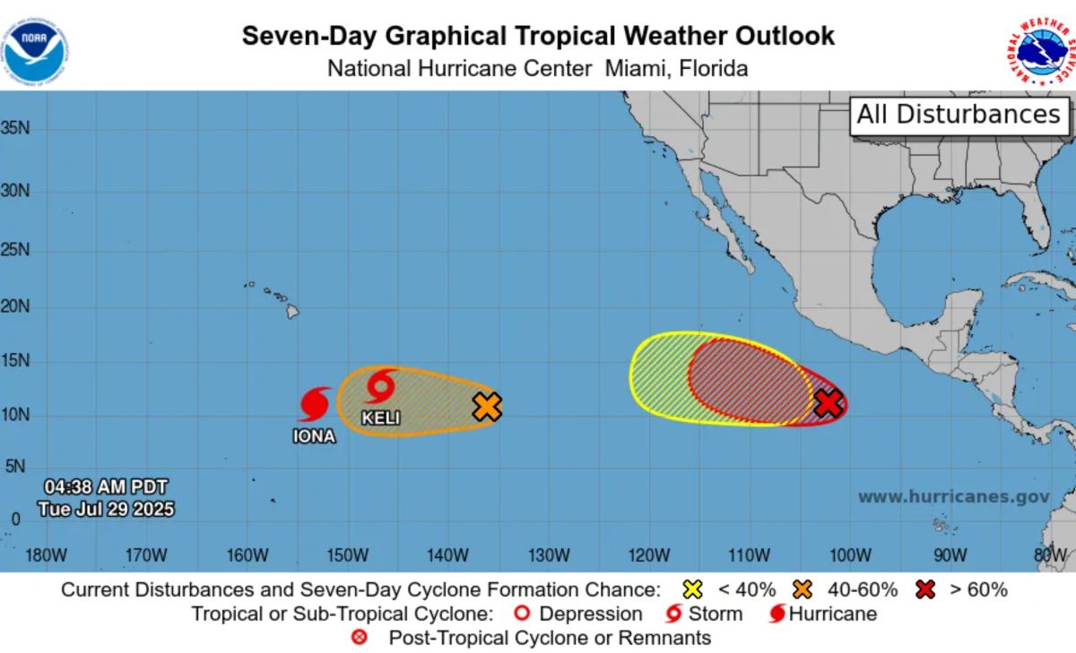Ngày 29.7, Trung tâm Bão Quốc gia Mỹ (NHC) đang giám sát tới 5 sóng nhiệt đới ở Đại Tây Dương và 5 hệ thống đang phát triển ở Thái Bình Dương, trong đó có bão Iona gần đạt cấp 4, gió giật lên tới 200 km/h, không loại trừ mạnh lên thành siêu bão.