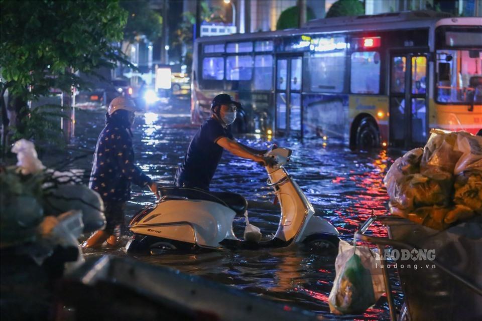 Mưa xảy ra với cường suất lớn gây ngập lụt nhiều tuyến phố ở Hà Nội đêm 13/6. Ảnh: Tô Thế.