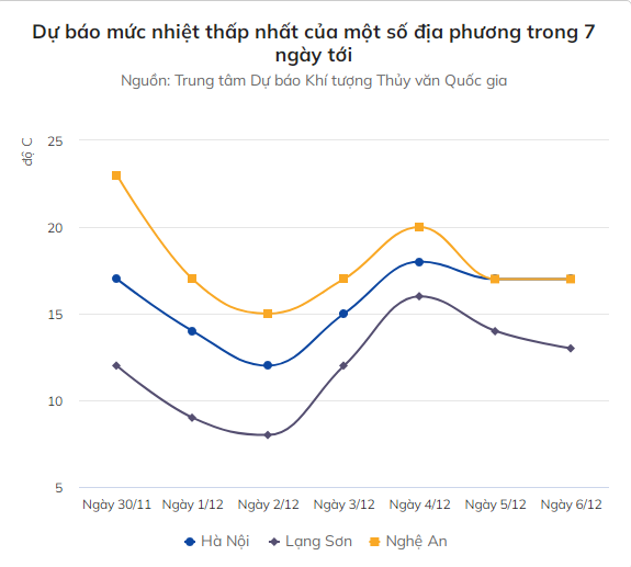 Đến ngày 3/12, rét đậm còn duy trì ở vùng núi và trung du, trong khi đồng bằng rét về đêm và sáng sớm. Ban ngày, nhiệt độ cao nhất 20-22 độ C, trời lạnh.