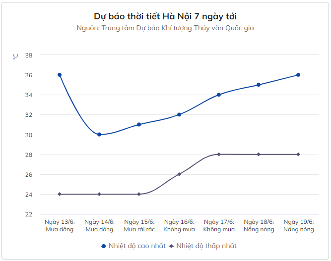 Trang Accuweather dự báo Hà Nội duy trì mức nhiệt phổ biến 30-35 độ C từ đầu giờ sáng đến khoảng 16h chiều 13/6. Cảm giác nóng bức và khó chịu có thể gia tăng khi người dân di chuyển trên đường bê tông, đường nhựa vào đầu giờ chiều. Lúc này, mức nhiệt cảm nhận lên tới 40 độ C.