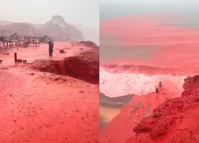 Vào ngày 16.12, những cơn mưa trút xuống đảo Hormoz nằm ngoài khơi bờ biển Iran đã tạo nên một hiện tượng thiên nhiên vô cùng kỳ thú. Khung cảnh ghi nhận được tại khu vực này là những thác nước mang màu đỏ thẫm đổ tràn từ các vách đá xuống bờ biển và những đợt sóng thủy triều đỏ rực vỗ vào bờ cát.