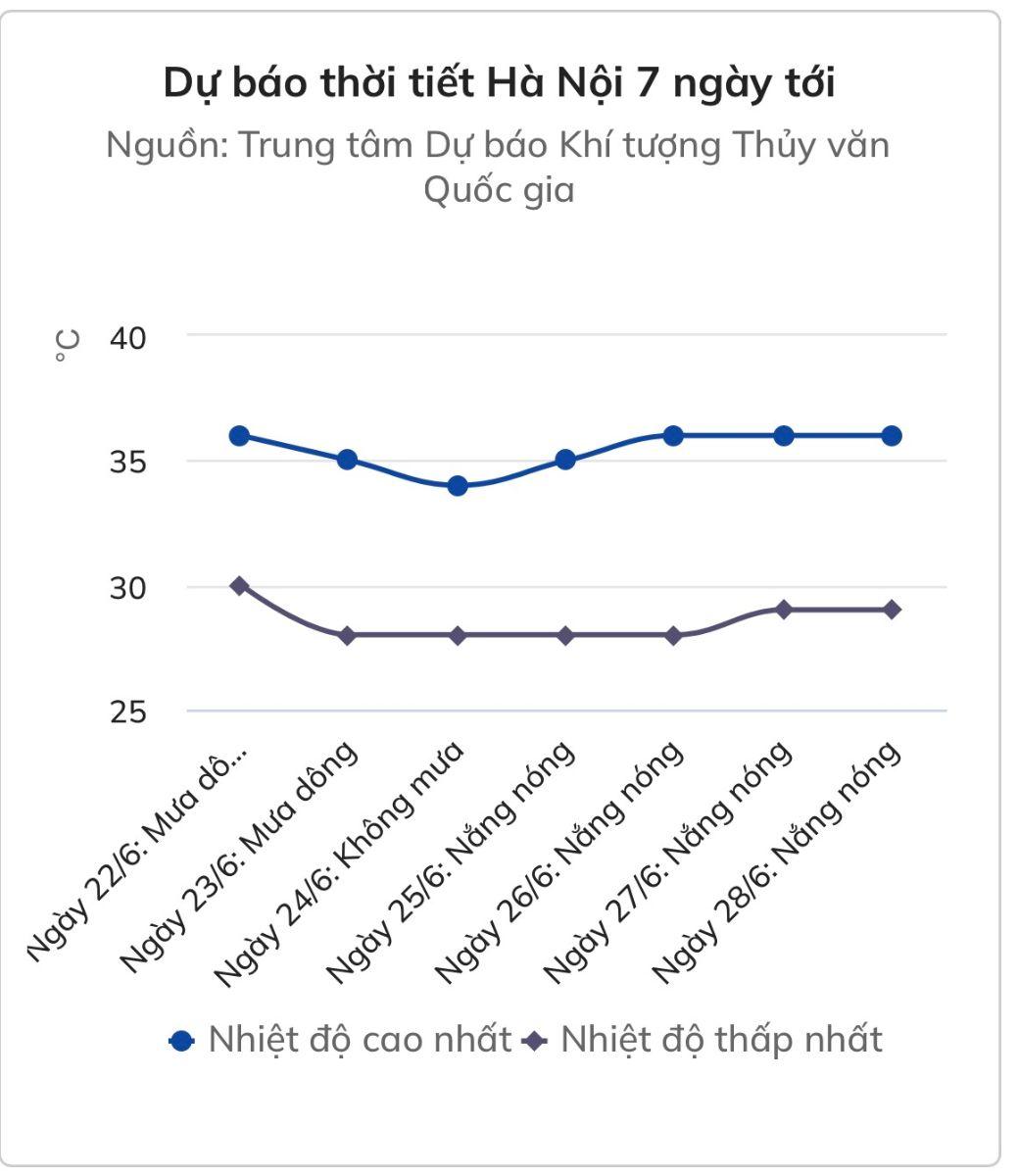 Đến ngày 22/6, miền Bắc bước vào ngày cuối cùng trong đợt nắng nóng gay gắt khi mức nhiệt cao nhất vẫn ở ngưỡng 35-37 độ C. Sau đó, thời tiết dịu dần xuống ngưỡng 34-35 độ C và duy trì trạng thái này đến cuối tuần.