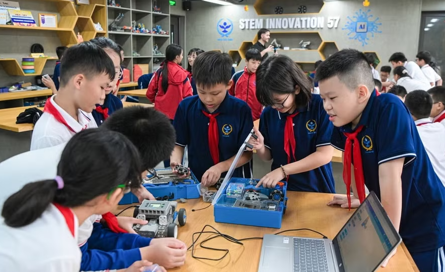 Học sinh Trường THCS Cầu Giấy (Hà Nội) thực hành trong phòng học STEM của nhà trường. Ảnh: NTCC