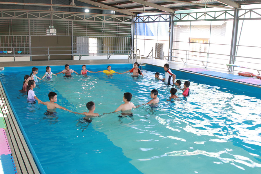Học sinh trường PTDT bán trú THCS được học bơi trong điều kiện an toàn. (Ảnh: Thành Tâm)