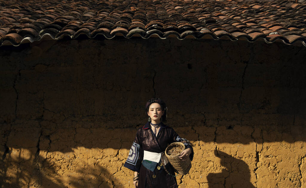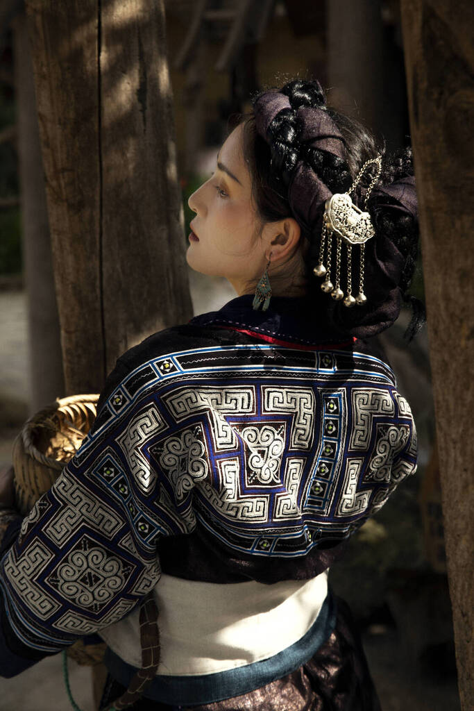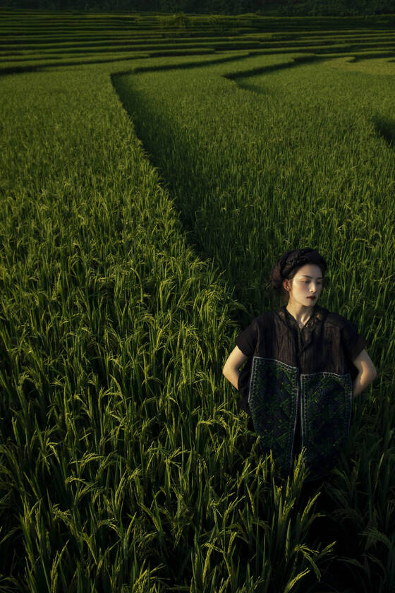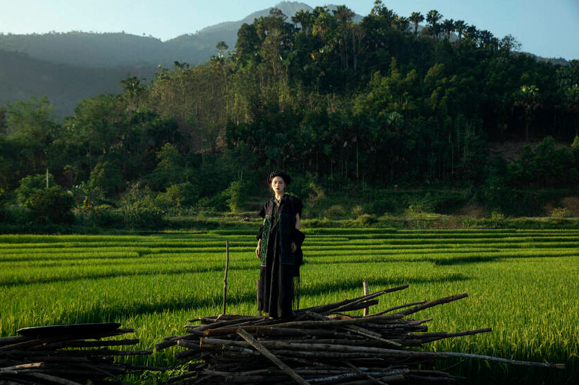 Bộ trang phục này được chị Phương thiết kế lại trên nền chất liệu hoàn toàn thủ công của người H’Mông. Mảng áo màu xanh lá nổi bật được thêu tay tinh xảo theo kỹ thuật thủ công truyền thống của người H'Mông ở Sa Pa, các chi tiết còn lại trên áo được làm từ vải lanh nhuộm thực vật, mang đậm dấu ấn văn hoá và sự bền vững trong thời trang dân tộc. Ảnh: Trần Sơn