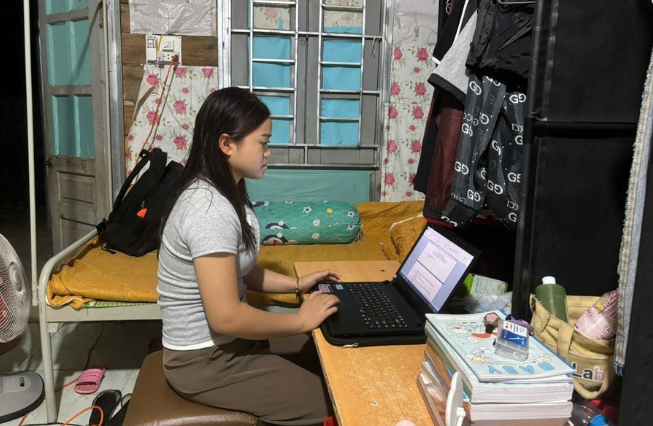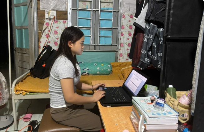 Cô Lường Ngọc Thương gấp gọn bộ tài liệu trên bàn để làm chỗ rót nước “đãi khách”. Căn phòng vừa đủ xếp 2 cái giường đơn và một chỗ làm bếp nấu ăn. Gọi là “bếp” nhưng thực chất đó chỉ là góc nhỏ của căn phòng đủ để kê cái bàn nhỏ, đặt chiếc bếp gas.