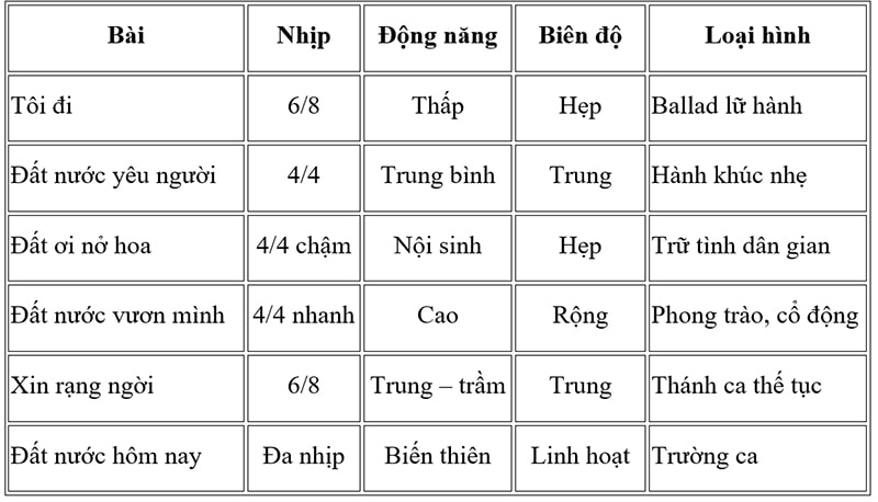 Về mặt âm nhạc, nhịp 6/8 tạo nên cảm giác lãng du, đung đưa và mềm mại. Tiết tấu không dồn dập mà trôi chảy, giai điệu chuyển động chủ yếu liền bậc với biên độ hẹp, tạo nên cảm giác ổn định nội tâm. Nhịp 6/8 ở đây không mang tính dân ca thuần túy mà gần với ballad trữ tình, nơi bước đi của chủ thể được thể hiện như một nhịp thở đều đặn. Chính sự mềm mại này đóng vai trò nền tảng tinh thần cho toàn bộ chuỗi tác phẩm phía sau. Nếu không có cái tôi lữ hành và hòa nhập này, không thể có sự bùng nổ tập thể ở các tác phẩm tiếp theo.