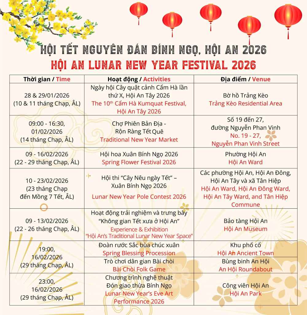 Hội An tổ chức “Hội Tết Nguyên Đán Bính Ngọ 2026” với nhiều hoạt động văn hóa, nghệ thuật, sinh hoạt tín ngưỡng đặc sắc từ giữa tháng Chạp đến hết tháng Giêng.