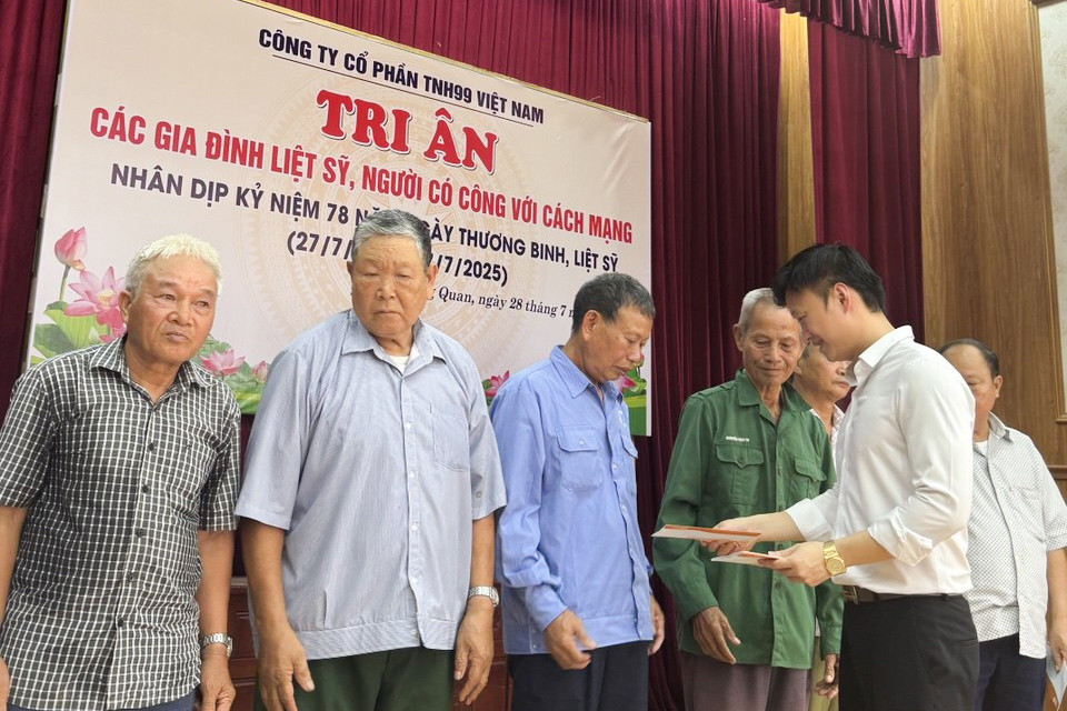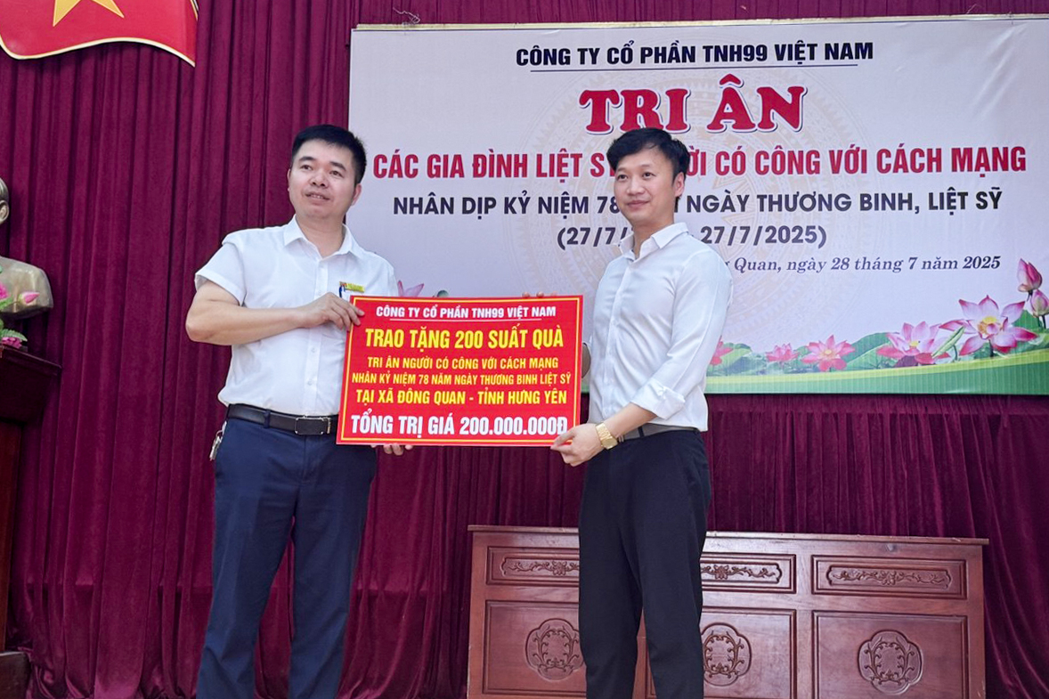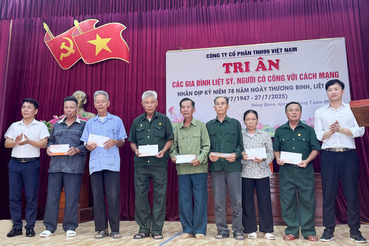 Trong không khí trang nghiêm và đầy xúc động nhân dịp kỷ niệm 78 năm Ngày Thương binh - Liệt sỹ, Công ty cổ phần TNH99 Việt Nam phối hợp cùng UBND xã Đông Quan (tỉnh Hưng Yên) đã tổ chức chương trình trao quà tri ân các thương binh, bệnh binh, thân nhân liệt sỹ và người có công với cách mạng trên địa bàn xã.